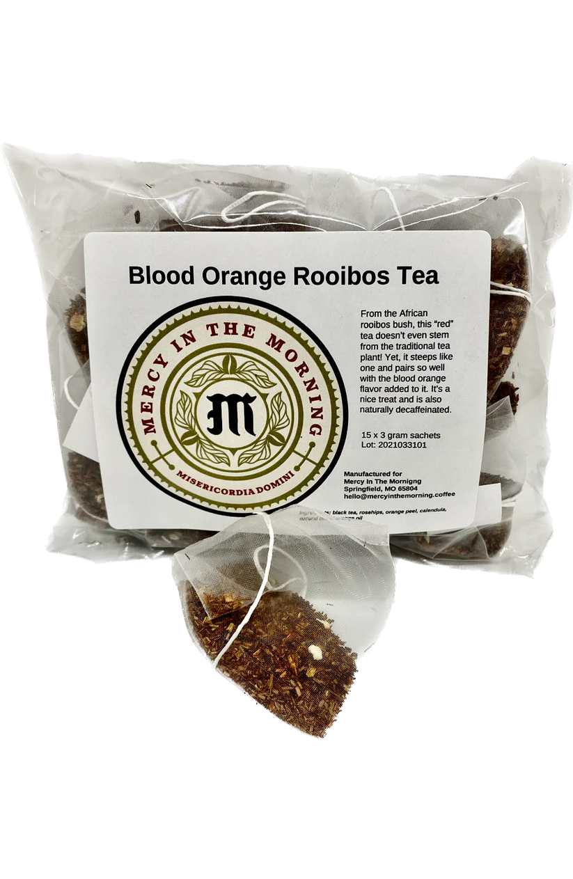 Indulge in a luxurious treat with our Mercy In The Morning Blood Orange Rooibos Tea. This exquisite blend of African rooibos bush and blood orange creates a unique and flavorful tea that is naturally decaffeinated. Enjoy the sophistication and exclusivity of a "red" tea that steeps like a traditional tea, but offers a new, indulgent experience.
